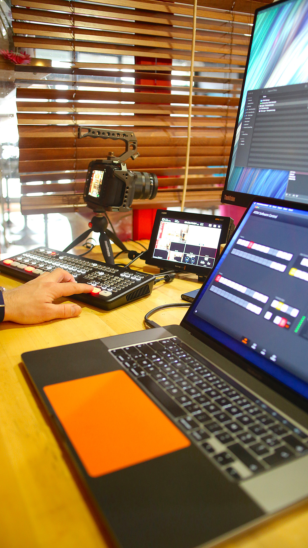 On peut envisager la mise en place d’un studio virtuel à partir de quatre caméras fixes. Les fonds peuvent être des images fixes lues à partir d’un media player et synchronisés selon les changements de caméras grâce à des macros. L’Atem Mini Extreme pourrait même devenir le parfait allié d’un logiciel de studio virtuel installé sur une station équipée d’une carte vidéo avec quatre sorties HDMI !
