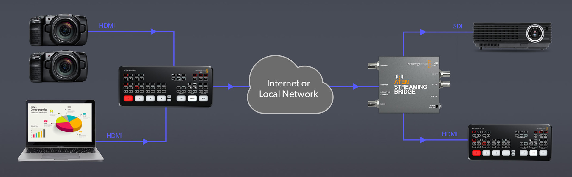 Un boîtier externe, l’Atem Streaming Bridge (vendu 21 euros) autorise l’affichage du flux H.264 d’un Atem Mini Pro ou Atem Mini Extreme, au sein d’un réseau interne ou à plus longue distance via Internet.